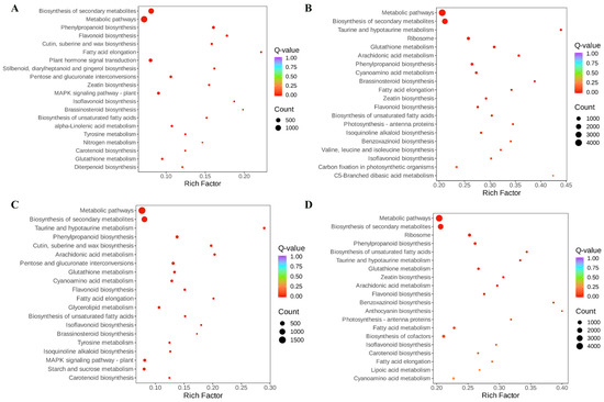 Diagram of KEGG enrichment of differentially expressed genes. (A) Comparison between Bg and Bs; (B) comparison between Hg and Bg; (C) comparison between Hg and Bg; (D) comparison between Hs and Bs (Hg: the disk flowers of HJ06; Hs: the ray flowers of HJ06; Bs: the disk flowers of BHYJ; Bg: the ray flowers of BHYJ).