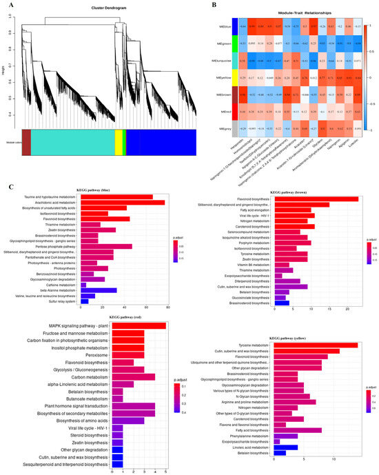 Co-expression network analysis. (A) Clustering dendrogram of DEGs; (B) module–trait associations. Each row corresponds to a module characteristic gene (eigengene), and each column corresponds to a trait. (C) KEGG enrichment analysis of genes within four modules (the four modules are blue, brown, red and yellow in that order). * indicates the compounds’ identification level was Level.