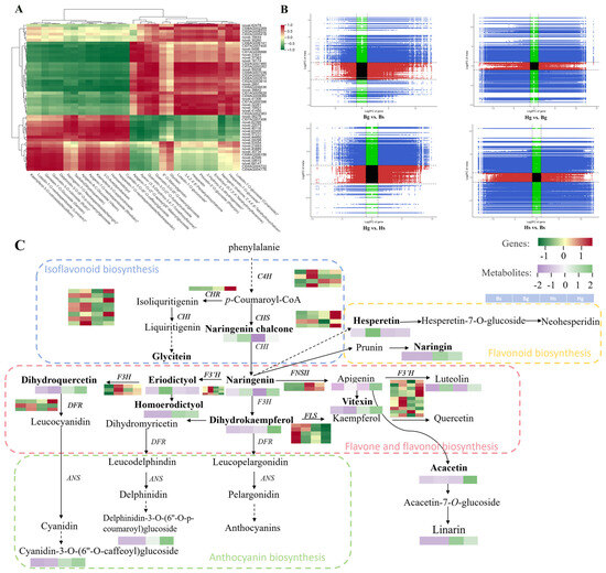 Joint metabolome and transcriptome analysis. (A) Correlation between flavone contents and differentially expressed flavonoid synthase gene expression; (B) nine quadrant plots between different samples; (C) regulatory network analysis of flavonoid accumulation (n = 3). * indicates the compounds’ identification level was Level.