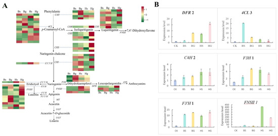 Expression patterns of flavonoid biosynthesis genes. (A) Heatmap of the expression levels of genes in flavonoid biosynthesis; (B) the relative expression levels of some genes in flavonoid biosynthesis.