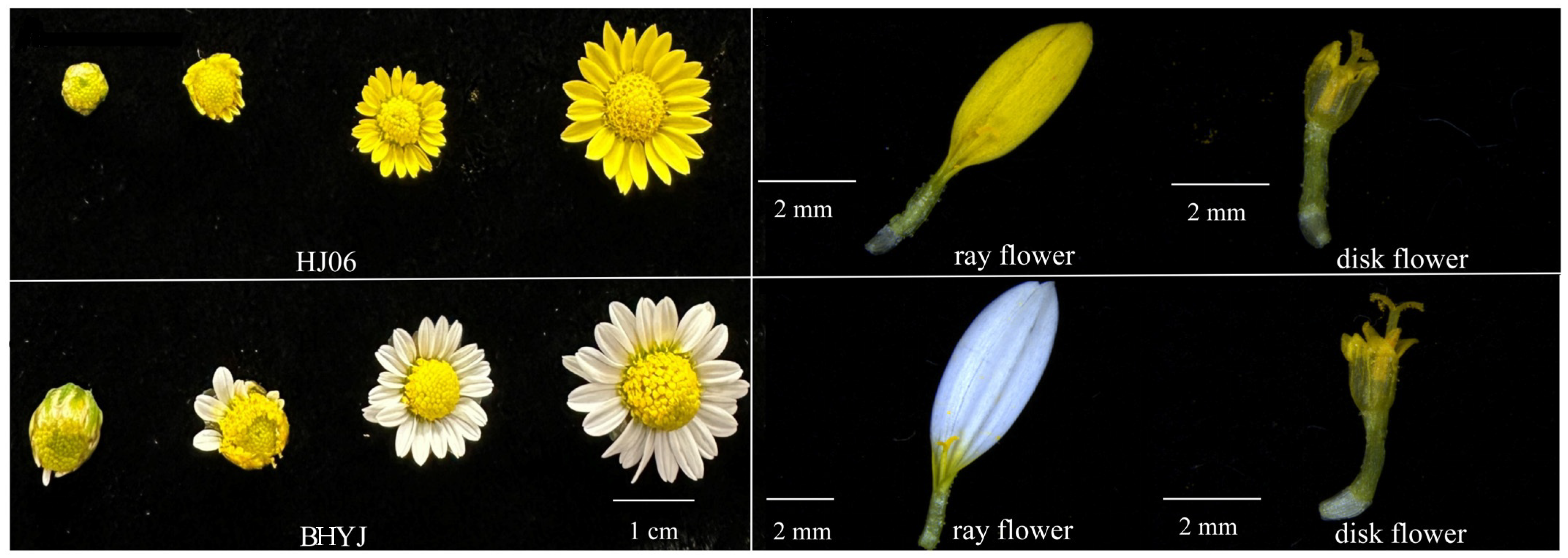 - Fan, J.; Huang, J.; Pu, Y.; Niu, Y.J.; Zhang, M.M.; Dai, S.L.; Huang, H. Transcriptomic analysis reveals the formation mechanism of anemone-type flower in chrysanthemum. BMC Genom. 2022, 23, 846. [Google Scholar] [CrossRef]