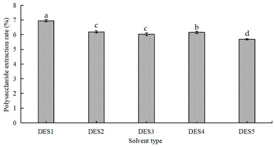 Effect of different DESs on polysaccharide extraction rate. (DES1) The mole ratio of choline chloride and ethylene glycol is 1:2. (DES2) The mole ratio of choline chloride and urea is 1:1. (DES3) The mole ratio of choline chloride and glycerol is 1:2. (DES4) The mole ratio of choline chloride and DL-malic acid is 1:1. (DES5) The mole ratio of choline chloride and citric acid is 1:1. Different letters represent different levels of significance, with ‘a’ indicating the highest significance and decreasing in order.