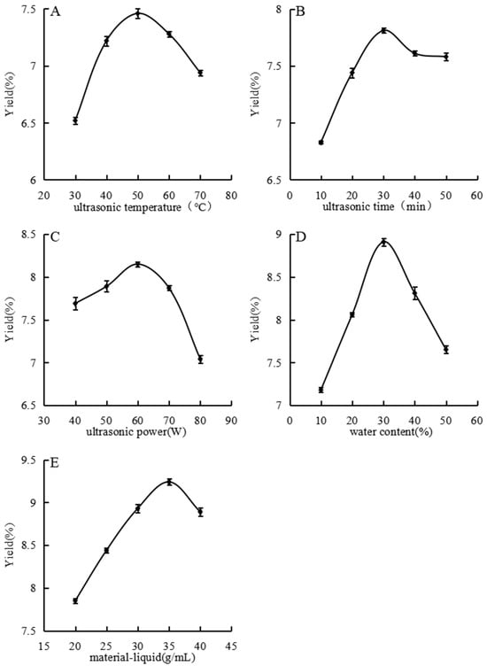 Effects of different ultrasonic temperature (A), ultrasonic time (B), ultrasonic power (C), water content (D), and material–liquid ratio (E) on extraction rate were studied.
