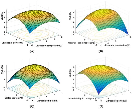 Response-surface plots for SLMP yield. (A) Effect of ultrasonic temperature and ultrasonic power on SLMP yield; (B) effect of material–liquid ratio and ultrasonic temperature on SLMP yield; (C) effect of water content and ultrasonic time on SLMP yield; (D) effect of material–liquid ratio and ultrasonic power on SLMP yield.