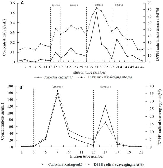 Purification of the polysaccharides. (A) DEAE-SepharoseTM Fast Flow column gel filtration of SLMPs; (B) SepharoseTM CL-6B gel filtration of SLMP3.