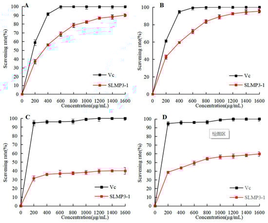 Antioxidant activity of SLMP3-1. (A) DPPH radical-scavenging activity; (B) ABTS radical-scavenging activity; (C) hydroxyl radical-scavenging activity; (D) total reducing antioxidant power.