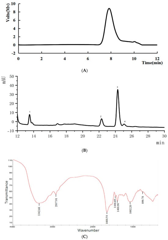 Figure 6A shows a symmetrical peak at approximately 8 min, indicating the polysaccharide’s molecular weight of 20.7 kDa.