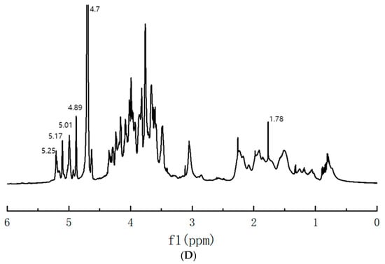 In the 1H NMR spectrum (Figure 6D), anomeric protons in α- and β-configured pyranose rings appeared at δ 5.1–5.8 and δ 4.3–4.8 ppm, respectively [40]. SLMP3-1 showed signals between δ 4.80 and 5.25 ppm, indicating α-configuration. Peaks at δ 4.89, 5.01, 5.14, and 5.25 ppm corresponded with α-Gal, α-Glc, α-Man, and α-Ara, respectively [41]. In glycosidic linkages, signals ranging from δ 3.2 to 4.5 ppm indicated overlapping H-2 to H-6 protons [42], in line with the FT-IR and monosaccharide analysis results.