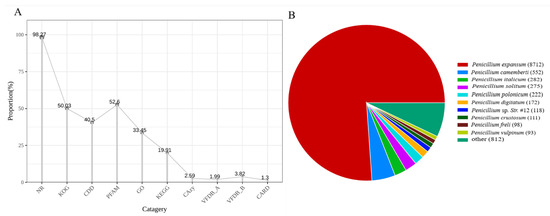 Genomic features of P. expansum 3.3703. (A) Proportion of genes annotated against major databases (NR, COG, KOG, Pfam, Swiss-Prot, TrEMBL). (B) Distribution of homologous species based on BLAST analysis. The sector area represents the quantity of sequences aligned to each species (larger areas correspond to higher sequence counts), with species names annotated in the legend.