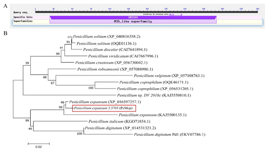 Bioinformatic analysis of PeMep. (A) Functional domain analysis of PeMep, showing the conserved M35 metallopeptidase motif (HRXXH). (B) Phylogenetic tree of PeMep.