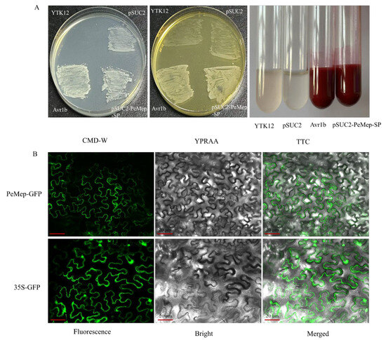 Characterization of PeMep. (A) Validation of PeMep signal peptide functionality using the yeast YTK12 strain. Growth on YPRAA medium and TTC chromogenic reaction confirm secretory activity. CMD-W: Tryptophan-deficient medium; YPRAA: Raffinose medium; TTC: Color reaction solution; YTK12: Plasmid-free control strain; pSUC2: Empty vector negative control; Avr1b: Positive control (B) Subcellular localization of PeMep-GFP fusion protein in N. benthamiana epidermal cells. Scale bar: 20 μm.