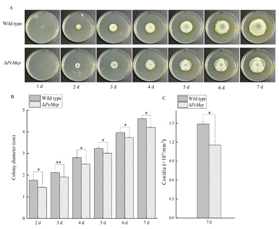 To assess radial growth, 30 μL aliquot of conidial suspensions from wild-type and ΔPeMep strains were centrally inoculated on PDA plates. The plates were incubated at 25 °C under dark conditions, with colony diameters measured daily for 7 days after inoculation (dai).