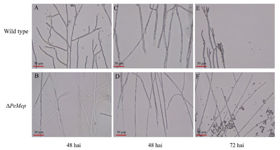 Hyphal morphology of wild-type and ΔPeMep. (A,B) Mid-region hyphae at 48 h after inoculation (hai). (C,D) Hyphal branching at basal regions (48 hai). (E,F) Hyphal tips at 72 hai. ΔPeMep exhibits reduced septation and aberrant branching. Scale bars: 50 μm.