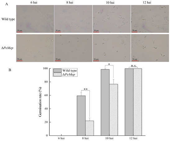 Germination dynamics of wild-type and ΔPeMep conidia. (A) Microscopic images of germinated conidia at 6, 8, 10, and 12 h after inoculation (hai). (B) Germination rates quantified at each time point (n = 3). Data: mean ± SD; t-test: * p < 0.05, ** p < 0.01 vs. wild-type; n.s.: not significant. Scale bars: 50 μm.