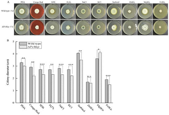 In order to detect the sensitivity of wild-type and ΔPeMep trains to cell wall inhibitors, oxidative stress, and osmotic stress, both strains were cultured in PDA medium separately supplemented with 0.7 g/L Congo Red, 0.4 g/L SDS, 1.2 M NaCl, 1.2 M KCl, 1.5 M Sorbitol, 0.015 M H2O2,0.003 M ZnSO4, or 0.3 M MgSO4 [37]. The diameter was measured after 5 days of incubation at 25 °C.