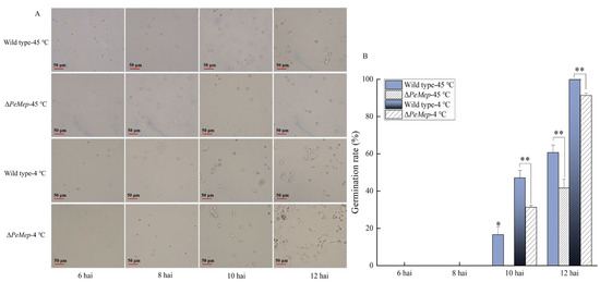 The effects of temperature on conidial germination of the wild-type and ΔPeMep. (A) Germination of conidia treated with high temperature (45 °C) and low temperature (4 °C) for 1 h, observed at 6–12 h after treatment. (B) Germination rates (n = 3). Data: mean ± SD; t-test: * p < 0.05, ** p < 0.01 vs. wild-type.