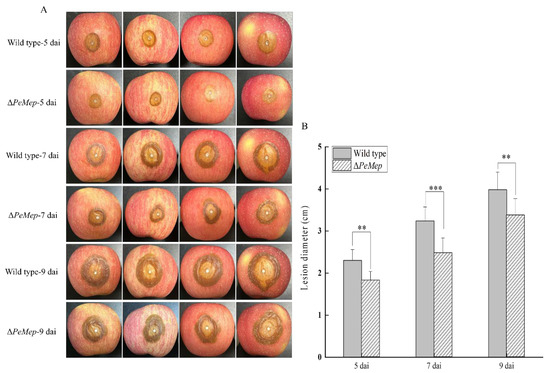 Virulence assay on apple fruits. (A) Lesion progression caused by wild-type and ΔPeMep at 5, 7, and 9 days after inoculation (dai). (B) Lesion diameters measured at each time point (n = 5 fruits). Data: mean ± SD; t-test: ** p < 0.01, *** p < 0.001 vs. wild-type.