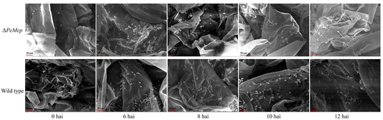 Pathogenicity assays on apple fruits demonstrated ΔPeMep’s attenuated virulence, with lesion diameters 15–30% smaller than wild-type at 5–9 days after inoculation (Figure 10). SEM analysis of inoculated apple tissues further demonstrated that ΔPeMep exhibited delayed conidial germination at 6 hai, whereas wild-type conidia had initiated germination. By 8 hai, ΔPeMep hyphae showed impaired penetration ability compared to the wild-type (Figure 11).