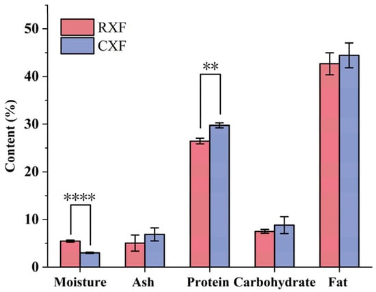 Chemical composition of XFP (mean ± SD, n = 3). ** p < 0.01 vs. RXF; **** p < 0.0001 vs. RXF.
