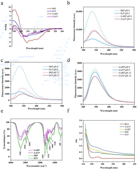 Fourier-transform infrared spectroscopy (FTIR) was employed to characterize the secondary structure of proteins. As shown in Figure 3e, the infrared spectra of XFP exhibited characteristic absorption peaks corresponding to hydroxyl and amino group stretching vibrations (3200–3400 cm−1), the amide I band (1655 cm−1), and the amide II band (1540 cm−1) [71]. Notably, SRP and SCP displayed strong absorption in these regions. The amide I band primarily originates from α-helix and β-sheet conformations, whereas the amide II band arises from N–H bending vibrations and C–N stretching vibrations. A significant reduction in absorption peak intensity was observed for AARP and AACP, suggesting a structural disruption of their secondary configurations.