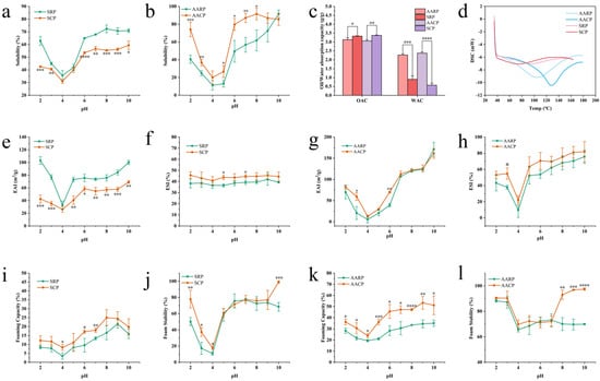 Following the method of Rezvankhah et al. [56], the solubility of XFP was analyzed across pH values ranging from 2 to 10. Lyophilized powders of AARP, AACP, SRP, and SCP were weighed and dissolved in 50 mL EP tubes containing pure water adjusted to target pH values (using 1 mol/L HCl or NaOH) to prepare 0.5 mg/mL sample solutions. The mixtures were centrifuged at 7100× g for 10 min. Protein content in the supernatant was quantified via the Bradford assay, and solubility was calculated using the following formula: