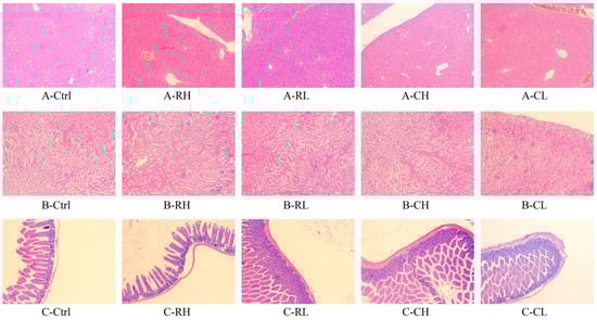 Body weights were monitored at 48 h intervals throughout the experimental period. After completing the 14-day treatment regimen, mice were subjected to a 12 h fasting protocol with free access to water prior to specimen collection. Fecal samples (150–200 mg) were immediately flash-frozen in liquid nitrogen and archived at −80 °C for subsequent microbiota profiling. Blood samples acquired through orbital venous plexus puncture were centrifuged at 1400× g for 10 min to isolate plasma, with 50 μL aliquots cryopreserved at −80 °C for metabolomic studies and the remainder utilized for ALT/AST biochemical analysis. Systematic tissue processing included the following: glutaraldehyde fixation of jejunal segments for transmission electron microscopy; saline-perfused hepatic and renal tissues that were weighed and preserved in 4% paraformaldehyde for histopathological evaluation; and ileal specimens with luminal contents preserved separately at −80 °C for enzymatic activity assays (ANP and trypsin).
