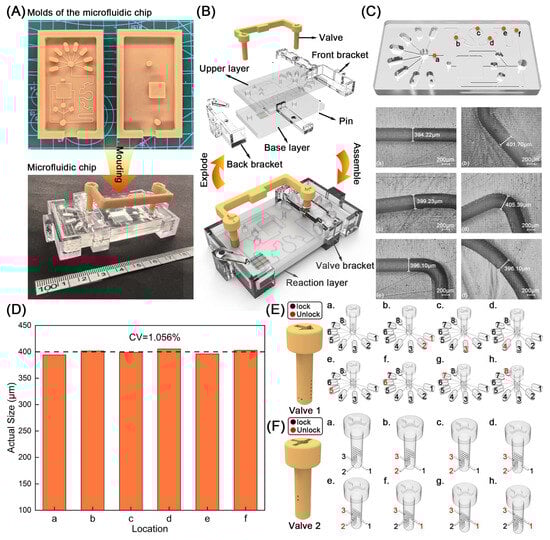 (A) The developed molds, the cured microfluidic chip, valve, and bracket. (B) Exploded and assembled diagrams of the microfluidic chip. (C) Photographs of microchannel (a–f) with the size ranging from 394.22 μm to 405.39 μm; (a–f) corresponding dimensions of six locations in the microchannel; (D) Quantitative analysis of the microchannel; (E) Valve 1 manipulation state for quantitative analysis. 1–8: Eight reservoirs of the microfluidic chip storing sample, capture antibody, PBST, IgG-Biotin, SA, ALP-Biotin, CL substrate, and PNPP, respectively. (F) Valve 2 manipulation state for quantitative analysis. 1–3: Three microchannels of the microfluidic chip.
