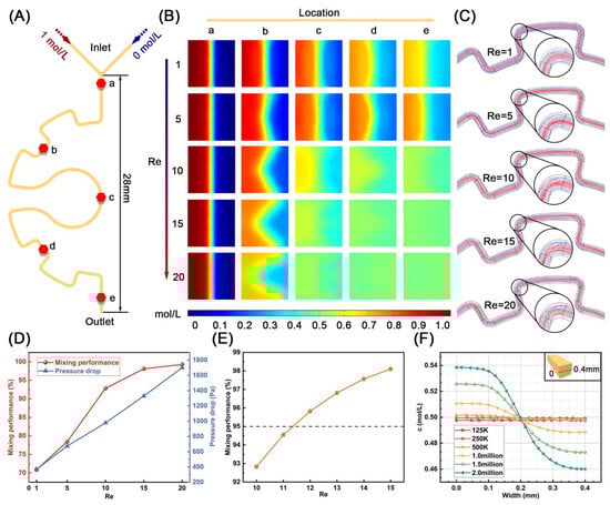 (A) Schematic drawing of the micromixer. (B) The mixing performance of each cross-section (a–e) at different Re. (a–e) Five locations of the micromixer in (A). (C) The streamlines in the micromixer with Re from 1 to 20. The mixing efficiency of the microchannel exit at Re ranges from (D) 1 to 20 and (E) 10 to 15. (F) Grid independence verification of the micromixer.