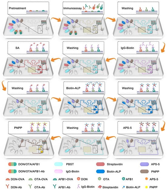 In Figure 3, eight reagents, including the sample, capture antibody, PBST, IgG-Biotin, SA, ALP-Biotin, APS-5, and PNPP, were introduced into the chip. First, the sample with DON, OTA, and AFB1 and the capture antibodies DON-Ab, OTA-Ab, and AFB1-Ab were introduced simultaneously into the reaction layer and three incubation reservoirs. Antigens in the sample competed with on-chip antigens DON-OVA, OTA-OVA, and AFB1-OVA for the capture antibodies. Antibodies bound to on-chip antigens remained in the reaction layer and incubation reservoirs. Biotin-labeled detection antibodies of IgG-Biotin were then introduced into the reaction layer and incubation reservoirs to bind specifically to capture antibodies. SA was then introduced into the reaction layer and incubation reservoirs to combine with the biotin on detection antibodies. Biotin-ALP was then introduced to bond with the SA on the detection antibody to form IgG-Biotin-SA- (Biotin-ALP) n conjugate. Next, APS-5 was introduced into the reaction layer to react with ALP to produce CL arrays and bypassed the incubation reservoirs to avoid cross-reactions. Finally, PNPP flew into the incubation reservoirs and reacted with ALP to produce yellow signals with an absorbance of 405 nm. Significantly, each key detecting procedure in the microfluidic chip was connected to 5–7 times PBST cleaning to avoid cross-reaction and affect the actual test. The detected signals, including the CL signal and color signal, were negatively correlated with the concentration of mycotoxins.