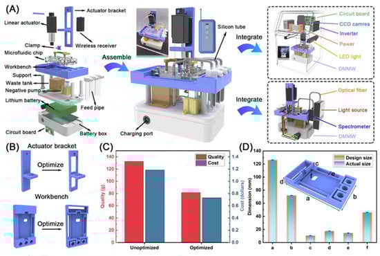 (A) The exploded and assembled DMMW integrated with the CCD system and fiber optic spectrometer. (B) Optimization of key parts (actuator bracket and workbench). (C) The comparison of quality and cost between unoptimized and optimized key parts. (D) The comparison of actual and design dimensions of the workbench.