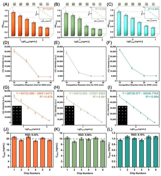 OD405nm of (A) DON, (B) OTA, and (C) AFB1 at different concentrations. Optimization of the competitive reaction time for detecting (D) DON, (E) OTA, and (F) AFB1. Liner range of (G) DON, (H) OTA, and (I) AFB1 by CL intensity. Reproducibility of DON (J), OTA (K), and AFB1 (L).