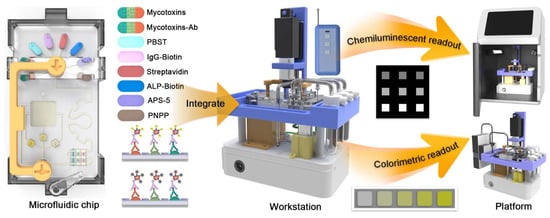 - Xiang, X.R.; Song, M.H.; Xu, X.W.; Lu, J.R.; Chen, Y.Y.; Chen, S.H.; He, Y.L.; Shang, Y.T. Microfluidic Biosensor Integrated with Signal Transduction and Enhancement Mechanism for Ultrasensitive Noncompetitive Assay of Multiple Mycotoxins. Anal. Chem. 2023, 95, 7993–8001. [Google Scholar] [CrossRef]