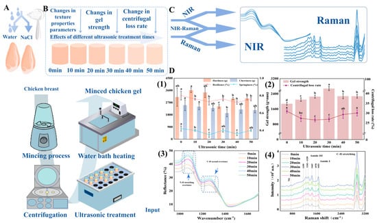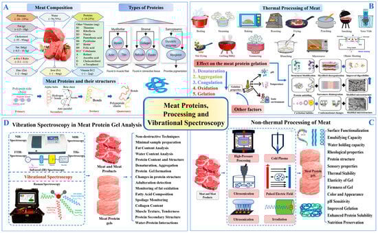(A) A representation of meat composition, types of meat proteins, and their structure. (B) The thermal processing of meat and its effect on meat protein gel formation. (C) The non-thermal meat processing and its effect on meat protein gel. (D) The application of vibrational spectroscopy in meat protein and meat protein gel analysis.