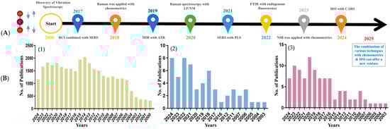 (A) The time-based evolution of vibrational spectroscopic techniques (2017 to 2024) [13]. (B) (1) Number of publications for vibration spectroscopy for meat protein analysis. (2) IR spectroscopy for meat protein analysis. (3) Raman spectroscopy for meat protein analysis. Abbreviations: RCI = Raman Chemical Imaging, SERS = Surface-enhanced Raman Spectroscopy, MIR = Mid-infrared, ATR = Attenuated Total Reflectance, LF/NMR = Low-field Nuclear Magnetic Resonance, PLS = Partial Least Square, FTIR = Fourier Transform Infrared, NIR = Near Infrared, HIS = Hyperspectral Imaging, CARS = Competitive Adaptive Reweighted Sampling.