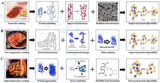 (A) Effect of sous-vide cooking on meat protein’s unfolding, proteolysis, microstructure, and protein digestibility. (B) Effect of low-temperature cooking on denaturation, oxidation, conformational and protein digestibility. (C) Effect of high-temperature cooking induces protein aggregation, promotes oxidation, and facilitates disulfide bond formation [28].