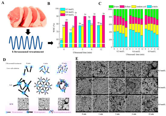 (A) Ultrasound treatment on pork meat. (B) Effects at different times on the WHC of myosin gel. Different letters (a–d) within the same NaCl concentration indicates significant difference (p < 0.05). Different capital letters (A–C) within the same treatment time of ultrasound indicates significant difference (p < 0.05). (C) Effects of 0.3–0.9 mol/L NaCl concentration and illustration of how ultrasound treatment on myosin gel (D) and potential effects on the secondary structure of myosin gel. (E) SEM analysis of myosin gel [63].