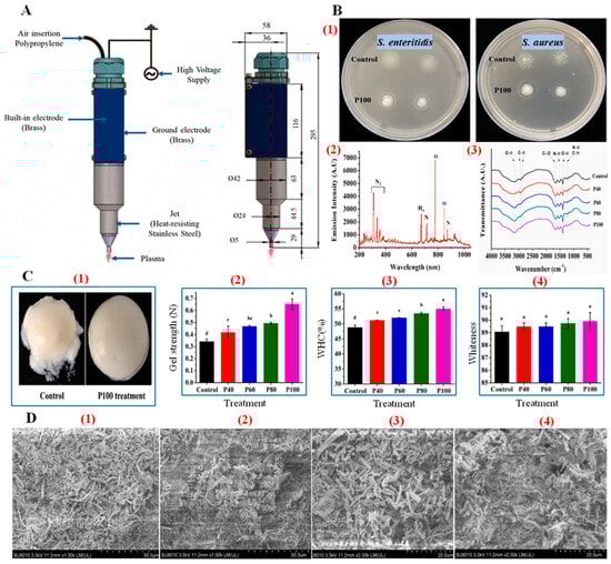 (A) Schematic representation of the plasma jet device [86]. (B) (1) Antimicrobial effects of plasma treatment on S. Enteritidis and S. aureus, showing inhibition zones for control and P100 treatment. (2) Emission spectra of the plasma, highlighting reactive species. (3) FTIR spectra of samples under different plasma treatments, showing changes in functional groups and bond vibrations. (C) (1) Visual comparison of gel appearance for control and P100-treated samples. (2) Gel strength comparison across different plasma treatments (P0, P40, P60, P100). (3) WHC results for each treatment. (4) Whiteness values after different plasma treatments, (a–d): different letters indicate significant differences (p < 0.05). (D) SEM micrographs of gel structure showing microstructural differences in the gel network under different plasma treatments (1, 3): Control, (2, 4): P100 treatment [85].