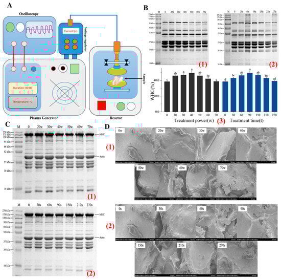 (A) Schematic representation of dielectric barrier discharge setup. (B) SDS-PAGE analysis of crude proteases from golden pomfret after CAP treatment: (1) different power levels; (2) different treatment times. (3) Water holding capacity of meat after CAP treatment, a–d: Different letters indicate significant differences (p < 0.05). (C) (1) and (2) SDS-PAGE of muscle proteins after regular pressure CAP treatment: (1) different power levels; (2) different treatment times. (D) SEM micrographs of plasma-treated proteins: (1) different power levels; (2) different treatment times [87].