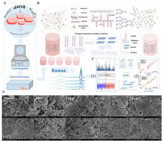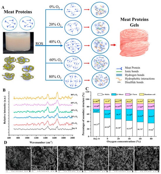 (A) Illustration of pork gels stored under a modified atmosphere of varying O2 concentrations. (B,C) Raman spectra of secondary structures of proteins, a–f: Different letters indicate significant differences (p < 0.05). (D) 1 SEM images of the microstructure of pork paste gels modified and adapted from [95].