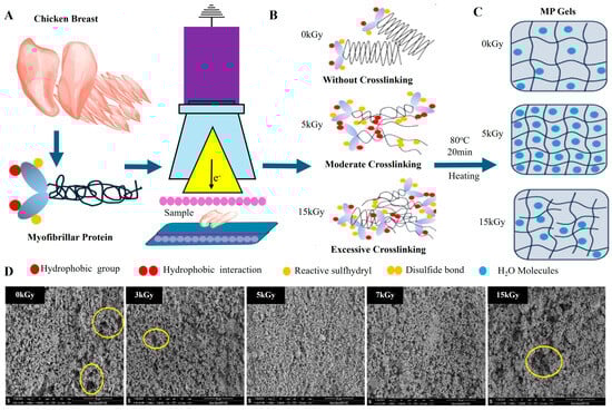 (A) Schematic of E-beam irradiation on chicken myofibrillar protein structure. (B) Protein crosslinking stages at different irradiation doses, no crosslinking (0 kGy), moderate crosslinking (5 kGy), and excessive crosslinking (15 kGy) after heating at 80 °C for 20 min. (C) MP gel structures represent increased network density from 0 to 15 kGy. (D) SEM images displaying microstructural changes in MP gels across irradiation doses [101].
