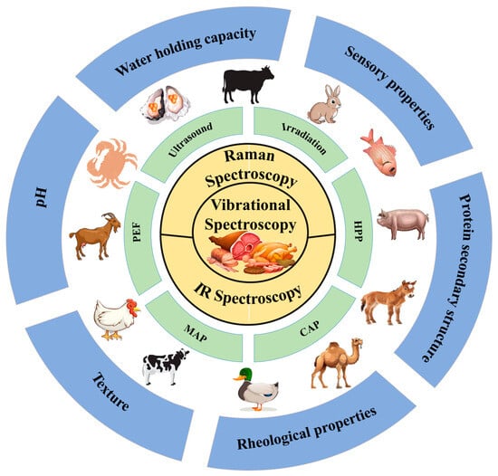 Vibrational spectroscopy has become a cornerstone in optimizing non-thermal food processing, primarily due to its capacity for real-time monitoring of protein dynamics—including denaturation, gelation, and aggregation—which enables data-driven process control for consistent product quality [112], as illustrated in Figure 10. As a non-destructive analytical platform, these techniques provide critical insights into molecular interactions and structural transformations, thereby driving innovation in food science to meet growing consumer demands for minimally processed, nutritionally enhanced, and safer meat products [113]. Within this technological framework, Raman spectroscopy, infrared spectroscopy, and hyperspectral imaging have emerged as particularly versatile modalities, each offering unique advantages in spatial resolution, chemical specificity, or multidimensional data acquisition during processing [114].