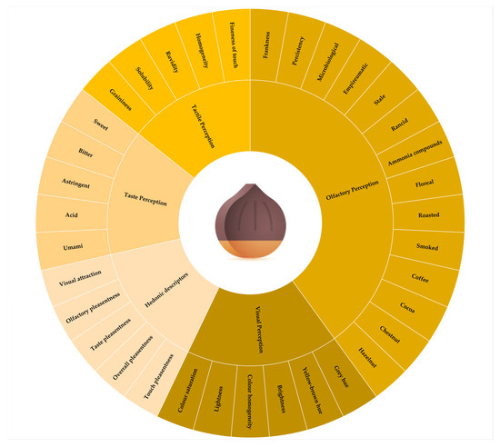 The QDA sensory test was conducted with a final set of 30 descriptive parameters (Figure 1) composed of both quantitative descriptors (sub-divided into visual, olfactory, tactile, and taste perceptions) and hedonic descriptors. In addition, judges were permitted to input free descriptors for each descriptor category.