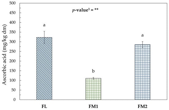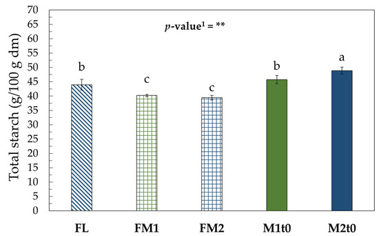 Total starch (g/100 g dm). Values represent the mean ± standard deviation (SD) of three samples. Different letters indicate significant difference among values (Turkey’s HSD, p < 0.05). 1 Significance level: ** = p < 0.01.