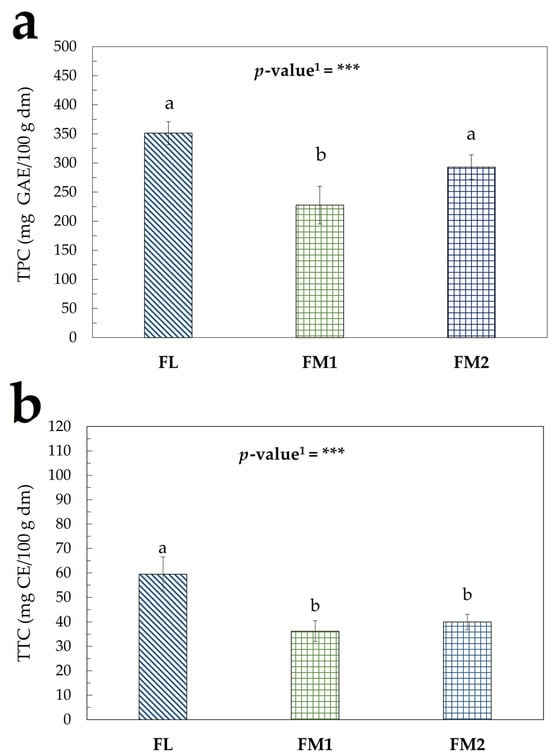 Figure 2 shows the total starch content of fresh chestnuts and their derived flours. Although significant decreases in starch content are observed when comparing M1t0 and M2t0 with their corresponding flours (M1t0: FM1; M2t0: FM2, FL), these differences are not substantial enough to account for the increase in free sugar content reported in the flours (Table 1).
