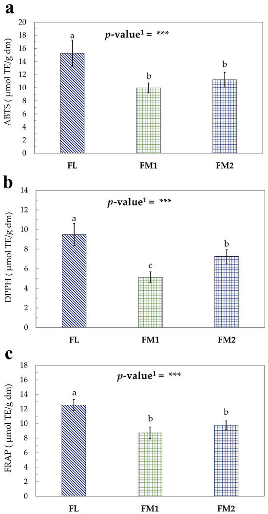 The antioxidant activity was assessed with three different assays: the ABTS method by reading the absorbance at 734 nm, the DPPH method by reading the absorbance at 515 nm, and the FRAP method by reading the absorbance at 593 nm [35]. The results were expressed as µmol Trolox equivalents (TE) per g dm of sample, based on different standard curves of Trolox (Sigma-Aldrich, Steinheim, Germany): 0–200 µmol L−1 for the DPPH assay, 0.2–1.5 mM range for ABTS, and 0–2.0 mM for the FRAP assay.