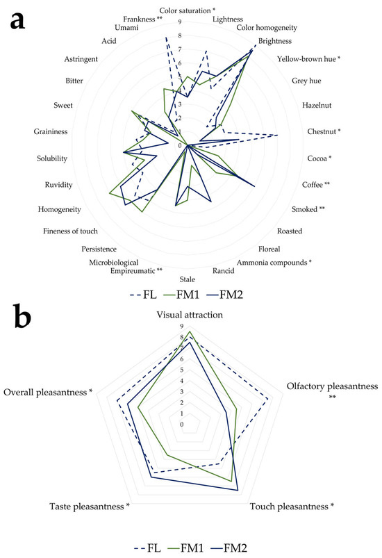 Median of the descriptor of the sensory profile of chestnut flour: (a) quantitative; (b) hedonic significance level: * = p < 0.05; ** = p < 0.01; without asterisk = p ≥ 0.05.