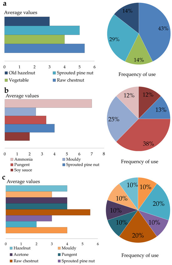 In addition, the panel evaluated the free descriptors associated with the olfactory profile of the samples, as illustrated in Figure 7a–c. The graphs report the average values of the free attribute and the frequency of their use.