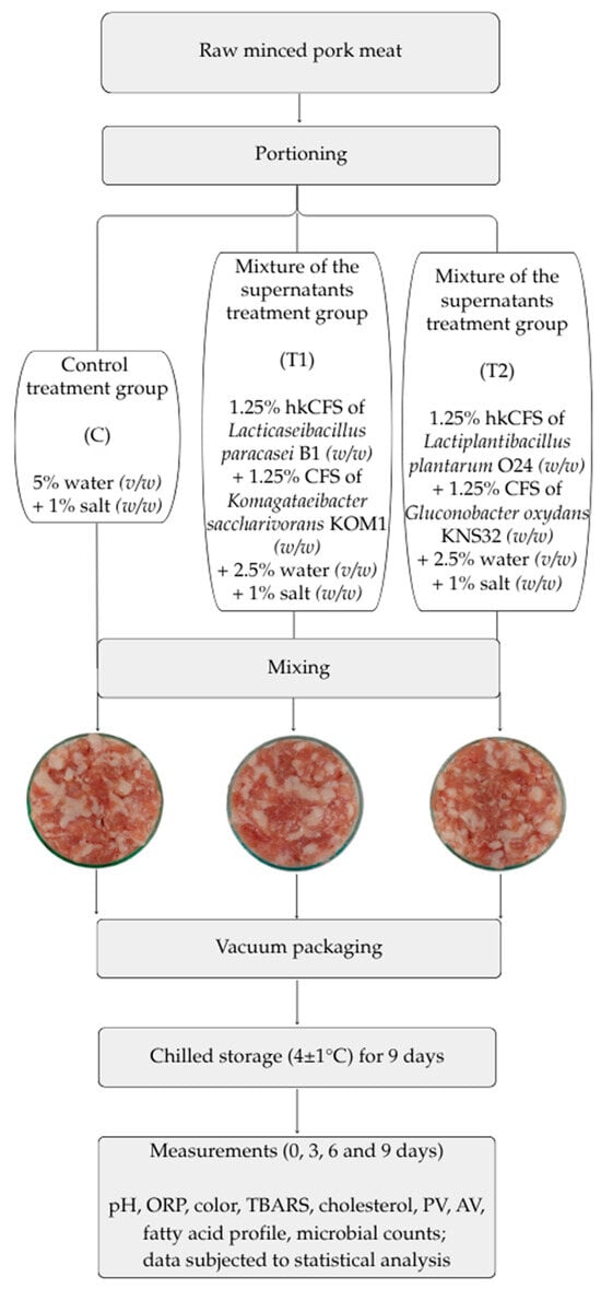 The raw material used for the study consisted of lean meat and fat from pork ham, minced using an 8 mm mesh. The meat was excised 48 h post-mortem from carcasses chilled at 2 °C. The raw material used had no quality defects. The chemical composition of the minced meat was as follows (mean values ± SD for three batches of raw material): water content [%]—60.95 ± 1.83, total protein content [%]—16.00 ± 0.90, collagen content [%]—1.36 ± 0.22, and fat content [%]—22.48 ± 2.25. The meat was obtained from a local, medium-sized processing plant near Warsaw, Poland. Experimental production was conducted in the technical hall of the Department of Meat and Fat Technology at the Institute of Agricultural and Food Biotechnology in Warsaw (Poland). The meat was subdivided into uniform portions for analysis. Raw minced pork meat samples were randomly assigned to three experimental groups: two treatment groups (T1 and T2) and one control group (C). Treatment group T1 received a formulation containing 1.25% (w/w) heat-killed cell-free supernatant (hkCFS) of Lacticaseibacillus paracasei B1, 1.25% (w/w) cell-free supernatant (CFS) of Komagataeibacter saccharivorans KOM1, 2.5% (v/v) distilled water, and 1% (w/w) salt. Treatment group T2 was supplemented with 1.25% (w/w) hkCFS of Lactiplantibacillus plantarum O24, 1.25% (w/w) CFS of Gluconobacter oxydans KNS32, 2.5% (v/v) distilled water, and 1% (w/w) salt. The control group (C) consisted of samples without any bacteria-derived supplementation and was formulated with 5% (v/v) distilled water and 1% (w/w) salt (Figure 1). The concentration of cell-free supernatants (CFS) in treatments T1 and T2 was set at 2.5% (w/w), supplemented with 2.5% (v/w) distilled water to maintain a total additive level of 5%. This proportion reflects standard practice when preparing ready-to-cook minced meat products, where up to 5% water is typically added to improve texture and processing characteristics []. Preliminary in-house trials indicated that higher CFS concentrations adversely affected product quality, while 2.5% provided a functional effect without compromising sensory attributes. Similar concentrations were reported as effective in other studies using bacteria-derived supernatants in meat matrices []. For each treatment condition, the respective components were thoroughly mixed with a batch of raw pork meat to obtain a homogeneous mixture, which was then aseptically transferred into sterile polyethylene bags and vacuum-sealed into plastic casings to produce three (n = 3) individual replicates per group. This procedure used three pork meat batches (lots) on separate days. Samples were stored at 4 ± 1 °C in a controlled cold room environment and analyzed at 0, 3, 6, and 9 days post-processing to evaluate changes over time. Time and storage conditions were established based on preliminary research. Time-zero samples were analyzed approximately two hours after processing. Figure 1 shows an overview of the experimental design and model appearance of the study’s minced pork samples after preparation.