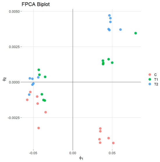 PC1 mainly reflected the overall mean levels of the studied parameters across the storage period. The FPCA shows that higher PC1 values indicated above-average quality characteristics and were observed between the 4th and 6th day of storage. The analysis of PC1 values demonstrated that samples associated with the T2 treatment and samples related to the T1 treatment located in the upper right corner had the highest scores, suggesting the superior maintenance of quality attributes. Conversely, the control group samples displayed lower PC1 values, indicating faster deterioration in quality. Although PC2 accounted for a small proportion of the total variance (3.46%), it appeared to reflect differences in the timing of quality parameter changes. Positive PC2 values suggested that the samples were approaching or had passed their maximum quality peak, typically observed between days 4th and 6th, while negative values indicated that the samples were at their peak quality state.