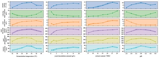 Extremely high or low pH levels are unfavorable for fermentation. As pH increases, the alcohol content initially rises and then declines. At pH 3.8, the reducing sugar content was the lowest, while the alcohol content, total phenolic content, total flavonoid content, and sensory evaluation score reached their highest values: (10.0 ± 0.5) %vol, (529.54 ± 10.24) mg/L, (316.69 ± 7.52) mg/L, and (67.4 ± 2.41), respectively. Furthermore, Tongwei Guan et al. found that SY jujube wine had a better taste at a pH of 3.15 [23], while Chenglin Zhu et al. used a pH of 4.0 when studying the metabolomics of Guang’an Honey Pear Apple wine [24]. Therefore, it indicates that SY has good adaptability between 3.15 and 4.0, and our research results are consistent with the above findings, which precisely supports this point.